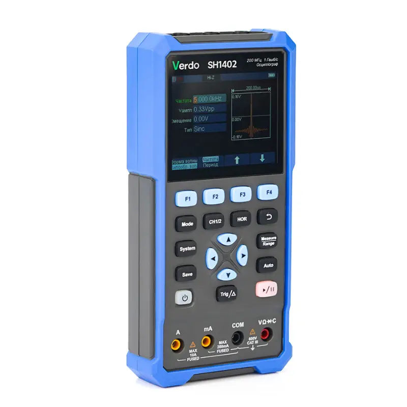 Осциллограф-мультиметр VERDO SH1403 представляет собой современное цифровое измерительное устройство с двумя каналами, разработанное для точного анализа и визуализации электрических сигналов. Прибор обладает полосой пропускания 70 МГц и временем нарастания фронта импульса не более 5 наносекунд, что позволяет ему эффективно фиксировать даже быстрые и сложные сигналы с высокой точностью.